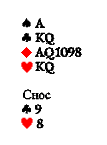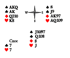 Ещё одно соображение, которое следует иметь в виду при заказе игры, точнее — аспект, в котором сосредоточена масса разнообразных соображений, — это безопасность и целесообразность — различная тактика при игре в «сочинку» и «ленинградку», а также при игре в «гусарика» (см. в первую очередь таблицу стоимости игр, Приложение 1 ). Нет смысла повторять, что в различных разновидностях соотношение между играми различно, и, следовательно, вы всегда делаете выбор в пользу оптимального решения, которое соответствует вашим планам. Представьте, что вы играете в турнире, который хотите выиграть. Перед последним туром вы прилично отстаёте. Вам приходит карта: