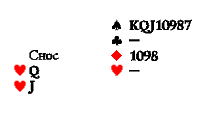В первую очередь похвалим разыгрывающего за правильный заказ: при данном раскладе игра с пиковым козырем дала бы ему возможность взять только шесть взяток. Теперь посмотрим на шансы вистующих. Если бы их тузы лежали на одной руке, то нужно было бы начать с самой длинной масти этой руки (если эта самая длинная масть не пика). В нашем случае вистующие должны начать с червей, чтобы успеть выработать себе третью взятку в черве (ведь лишняя взятка на висте тоже не валяется). Вот если бы черва лежала 4:2 (а пика 3:1, остальные масти без изменений), то разыгрывающий получил бы восемь взяток, разыграв сначала тот из марьяжей, туз которого соседствует с длинной червой. Tempo! Tempo! Il tempo `e denaro (время — деньги, как говорят итальянцы).