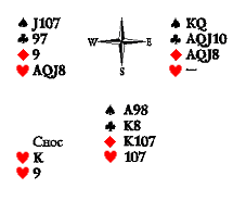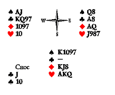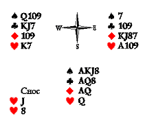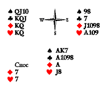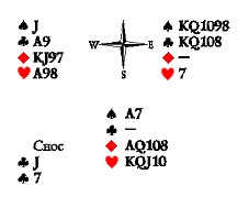 Когда вистующие показали козырное распределение, Юг наморщился. Но можно ли посадить самоуверенного разыгрывающего? И если можно, то как? Ответ прост: Запад должен сберечь свои трефовые отходы, которые ему понадобятся после получения взяток на козыри. Поэтому, взяв тузом червей, он должен пойти в черву или в пику. Юг возьмёт пику тузом, доберёт черву и выбьет пиковой семёркой одного из козырей Запада. Но теперь два трефовых отхода уберегут обладателя козырного виста от губительного хода в козырь. Разыгрывающий неминуемо отдаст три взятки на козырей и одну на туза червей. Без одной.