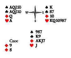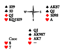 Предположительно, это девятка бубён и одна из десяток — пиковая или червовая. При любом из этих двух сносов у вистующих есть план, позволяющий избежать угадывания: убить черву, перейти по пике, добрать пику и убить третью черву валетом — даже если третья черва окажется в сносе, у Запада вырабатывается взятка на козырную даму (к сожалению, отложившийся синглетный валет червей не позволяет узнать наверняка о сносе червовой десятки — Юг может отдать короля и даму на первых двух кругах розыгрыша червы, сохраняя десятку как старшую карту в масти). Однако этот план нельзя назвать безопасным. Существует вариант сноса, который мы до сих пор не рассматривали: две пики. В этом случае добор второй пики приведёт к потере инициативы: ход попадёт к разыгрывающему, который незамедлительно отберёт козырей и легко возьмёт шесть взяток. Поэтому вистующие должны пренебречь возможностью убитки третьей пики (тем более что, если на руках у Юга есть три пики, значит, на третьем червовом круге точно наводится сюркуп и потерянная убитка пик возвращается в виде козырной взятки, а снос двух червей кажется невероятным) и сразу идти на убитку червей.