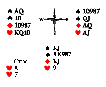 Что мы имеем с гуся? Пять козырей — это пять взяток (допустим). В пике KJ и в бубне KJ. И ещё есть три маленькие червы. Что же в сносе? Если бы у разыгрывающего была надёжная взятка в любой из некозырных мастей, он, вероятно, оставил бы три червы, чтобы достать козыря (на случай расклада козырей 3:0). Но такой надёжной взятки у него нет! Поэтому он мог оставить KJ в двух мастях, а снести две червы. Если это так, то мы получим не только пятую, но и шестую взятку, наведя сюркуп на козырную десятку по пике. Восток должен первым ходом пойти в пику, вырезая второго короля Юга. Запад добирает пику, возвращает ход Востоку по тузу червей, после чего третий ход в пику вынуждает Юга положить старшего козыря, чтобы не отдать взятку Западу на десятку треф. При этом плане розыгрыша вистующие отдают разыгрывающему только четыре взятки, при любом другом — пять.