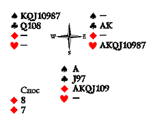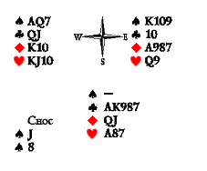 Вот если бы можно было поменять руки вистующих местами, то бубновый ход превратился бы в такой концовке в победный марш: червовые A10 были бы за королём с двумя фосками разыгрывающего и принесли бы вистующим кладущую взятку.