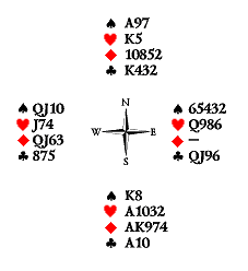 Задача вистующих — попытаться получить кладущую взятку, убив одну бубну Запада неиграющим козырем Юга. Для этого Юг делает первый ход в бубну, прорезая бубновые AQJ разыгрывающего. Защита от этого коварного плана очень проста. Запад не должен вскакивать тузом на первом ходу, прерывая тем самым связь по бубне между руками вистующих. Обратим внимание на то, что король бубён — единственная карта Востока, которая может получить взятку в этой сдаче. Так пусть лучше король заберёт эту взятку сразу. Теперь, когда Запад начнёт разыгрывать козырей (после любого второго хода вистующих) и Юг возьмёт взятку на козырного туза, он не сможет передать ход Востоку, от которого можно было бы нанести сокрушительный удар в бубну. Своя игра.