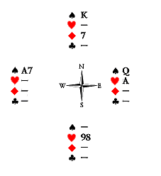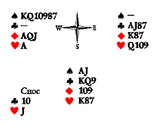 Запад не может препятствовать Северу получить взятку на козырного короля. Если он поставит туза пик, Север снесёт бубну; а козырную семёрку — надобьёт.
