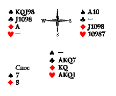 Довольно смело, не правда ли? Какие возникают идеи? Кого берёте? Выиграете восьмерную, играя за Юга, или посадите, выбрав вистующих? Предложите пари вашим знакомым! Однако сначала исследуем расклад. Чёрные масти лежат благоприятно для Юга: пиковая десятка и трефовая дама обеспечивают разыгрывающему по взятке на третьем ходу розыгрыша каждой масти (в пике на втором круге падает валет, а в трефе на втором круге падает король). План разыгрывающего сводится к тому, чтобы отдать ход опасному вистующему на ранней стадии розыгрыша. Вистующие начнут, очевидно, с одной из красных мастей, пытаясь выработать себе в ней третью взятку. Опасность представляет только Восток, который сможет получить взятку на отработанную третью даму в бубне или черве после взятки на короля треф. Когда король треф выйдет из игры, Восток уже не сможет получить ход. Поэтому Югу нужно сначала разыграть трефу. Когда он переключится на пику, у Запада не окажется третьей карты для получения кладущей взятки в бубне или черве.