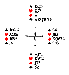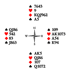 Имеет ли Север какой-нибудь приём? Это весьма сомнительно, однако, если у него есть бубновая фигура, то в случае короля — проблем нет; но если это вторая дама, то единственная возможность посадить контракт — снос туза бубён на третьем трефовом раунде.