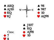 Восток сносит пиковую семёрку и ждёт сноса от Юга, которому в этой ситуации можно только посочувствовать: если он снесёт короля пик, Запад отберёт ещё пиковую десятку, а Восток снесёт на неё мелкую бубну; если же Юг снесёт от бубнового марьяжа, произойдёт разящее переключение на бубну и после отбора тузом короля восьмёрка бубновая возьмёт последнюю, седьмую взятку.