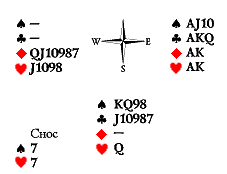 В последнем случае мы можем не дать больше взяток, устроив сквиз. Пойдём козырной дамой. Что снесёт Юг? Если десятку треф, продолжим тузом и валетом треф и отдадим последнюю черву тому, у кого туз червей. Если же Юг сносит черву, то ходим девяткой червей, а трефовую вилку держим на случай, если у Юга остались туз червей и K10 в трефе. В реальной жизни у Юга оказался марьяж червей. А полный расклад выглядел так: