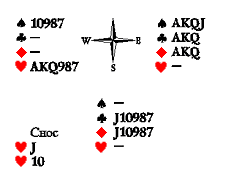 Этот расклад подробно рассмотрен в главе «Впустка» , [189] и доказательство там сводится к тому, что ни при каком раскладе любых мастей на этой карте нельзя проиграть девятерную игру при своём ходе и висте в светлую. А при игре втёмную разыгрывающему придётся угадывать и играть на второго короля червей или на второго валета. Если не угадает, то отдаст две взятки. Организовать впустку втёмную тоже может быть затруднительно, так как, во-первых, разыгрывающий не знает, лежат ли король с валетом на одной руке или на разных, а во-вторых, ему не известно, какие карты нужно предварительно отобрать в побочных мастях. Если вдруг вам доведётся заказать на этой карте девятерную и против вас будут вистовать втёмную, полезно знать, что наиболее предпочтительны ваши шансы на обвал синглетного или дублетного короля или валета: надо ходить тузом, а затем, если ни король, ни валет не упали, угадывать — пойти ли следующим ходом дамой или десяткой. Вероятность выиграть эту игру втёмную составляет примерно 50 %. Если вас посадят на этой девятерной, то заслуга будет целиком принадлежать вистующему, догадавшемуся закрыть вист.