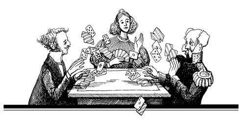 Следовательно, решение перехватывать валетом десятку пик — самое правильное. Мы рискуем одной лишней взяткой, т. е. пятью вистами, а выиграть можем 45 вистов. Полный расклад был таким: