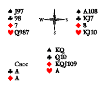 Условие: Запад заказал мизер (к тайному неудовольствию Юга). Ход Востока. Первые отрицательные эмоции вистующих, возникшие после того, как Юг выложил на стол свои старшие фигуры во всех мастях, уступили место поиску оптимального плана подсада.