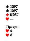 Вы заявляете мизер и прикупаете туза с восьмёркой червей. По договорённости в этой компании, игрок может отказаться от прикупа («бросить прикуп в морду»). В этом случае сдающий пишет 1 в гору.