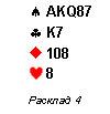 Если в раскладе 5 при распасовке на первой руке прогнозируются шесть-семь взяток, то в раскладе 6 — пять-шесть взяток, а на третьей позиции — четыре-пять взяток.