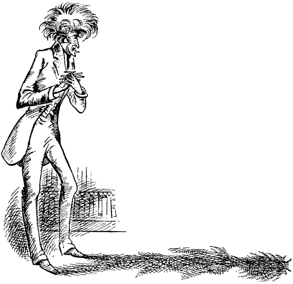 Дядя Эндрью был очень высоким и тощим, длиннолицым, остроносым, с необычайно блестящими глазами и седыми взъерошенными волосами. Сейчас он казался ещё страшнее, чем обычно. Дигори просто говорить не мог. Полли испугалась меньше, но и ей стало не по себе, когда дядя Эндрью молча прошёл к дверям и запер их на ключ. После этого он повернулся к детям, взглянул на них сверкающими глазами и обнажил в улыбке острые зубы.