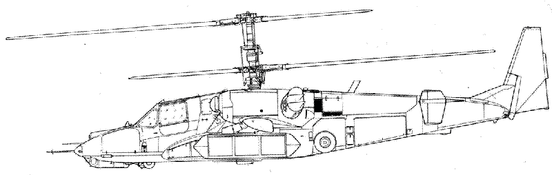Прототип № 8 (бортовой номер 018) с левого борта со снятыми ЭВУ. Установленны дополнительные системы для уточненного снятия параметров воздушного потока, сняты жалюзи над створкой шасси. Показан штатный вариант вооружения из ПУ ПТУР "Вихрь и двух блоков НУ PC Б-8В-1. Внутри выхлопного сопла хорошо просматривается кожух вала свободной турбины.