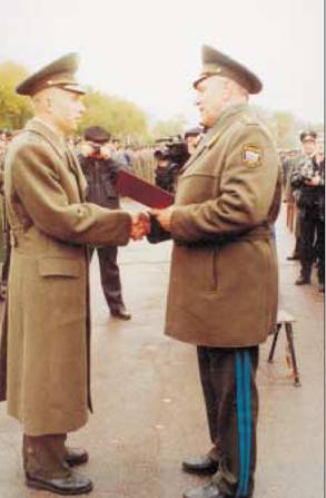 Генерал-полковник В.Е. Павлов вручает выпускнику диплом с отличием