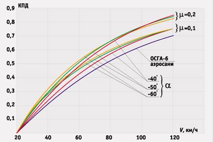Расчеты показывают, что КПД такого движителя в диапазоне скоростей, характерных для аэросаней, выше КПД пропеллеров известных моделей аэросаней (рис. 1). При определении КПД наклонного винта учитывалось, что наряду с движущей силой горизонтальной составляющей T xтяги винта вертикальная составляющая T yпомогает движению, уменьшая сопротивление скольжения опор аэросаней на величину T y, где – коэффициент трения опор саней.