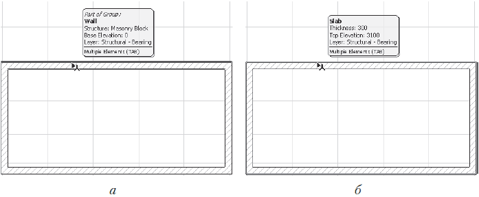 11. Нажмите клавишу Tab. Будет подсвечен контур перекрытия (рис. 8.1, б), информация о стене во всплывающем окне сменится на сведения о перекрытии.