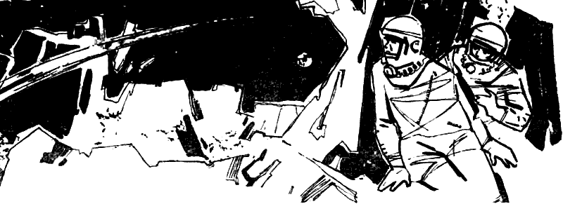 Небо то и дело вспыхивало. Приборы, определяющие радиоактивность среды, тревожно гудели, и их стрелки приближались к предельной красной черточке. Бурмаков озабоченно поглядывал на индикаторы и невольно торопился. Наверно, они попали почти в самый эпицентр космического атомного взрыва, который только что произошел на их глазах. Бурмаков подумывал уже, не лучше ли вернуться, как радиация стала постепенно падать… Костюмы могли пока что защитить людей от вредных излучений.