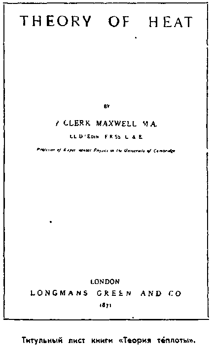 В Гленлейре была наконец завершена «Теория теплоты». В общем это был обычный курс теплоты, хотя и оплодотворенный статистическими идеями Максвелла. Но было в нем и необычное, сенсационное, интригующее – неприятие второго начала термодинамики в том виде, как его трактовали Вильям Томсон и Клаузиус. По Томсону и Клаузиусу, во всех тепловых процессах температурные уровни должны выравниваться, вся энергия в конце концов должна «обесцениться» и перейти в низшую, неупорядоченную форму – тепловую. И это в конечном счете должно привести к «тепловой смерти вселенной». В противодействие такой точке зрения Максвеллом был высказан в «Теории теплоты» парадокс. Максвелл предложил представить себе воображаемое миниатюрное существо, «...способности которого настолько изощрены, что оно может следить за каждой молекулой на ее пути и в состоянии делать то, что в настоящее время для нас невозможно... Предположим, что имеется сосуд, разделенный на две части А и Б перегородкой с небольшим отверстием, и что существо, которое может видеть отдельные молекулы, открывает и закрывает это отверстие так, чтобы дать возможность только более быстрым молекулам перейти из А в Б и только более медленным перейти из Б в А. Это существо, таким образом, без затраты работы повысит температуру в Б и понизит в А, вопреки второму началу термодинамики.