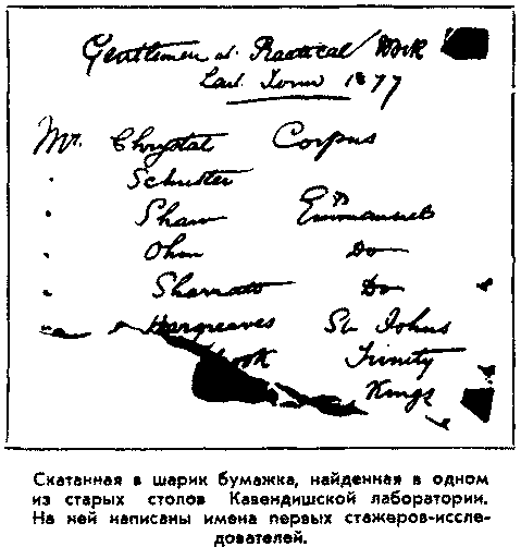 Уже через много лет после смерти Максвелла, да и через много лет после смерти его преемников на посту директора Кавендишской лаборатории лорда Релея, бывшего Джона Стрэтта, Дж.Дж.Томсона и лорда Резерфорда возникла необходимость передвинуть один из рабочих столов, стоящий в лаборатории со дня ее основания и использовавшийся по традиции всеми директорами лаборатории. Когда его отодвинули от стены, в нем стало возможным открыть еще один ряд ящиков – и в одном из них оказались забытые бумаги и приборы человека, расщепившего атом, – Резерфорда. А в глубине ящика завалялась скатанная в шарик, пожелтевшая от времени бумажка.